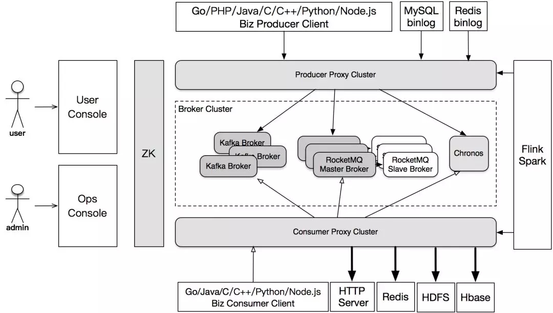 运维控制台,主要负责我们集群的管理,自动化部署,流量调度,状态显示之类的功能。最后所有运维和用户操作会影响线上的配置,都会通过ZooKeeper进行同步。