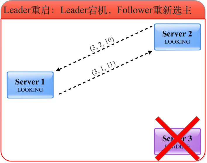 Leader(服务器3)宕机后,Follower(服务器1和2)发现Leader不工作了,因此进入LOOKING状态并发起新的一轮投票,并且都将票投给自己。