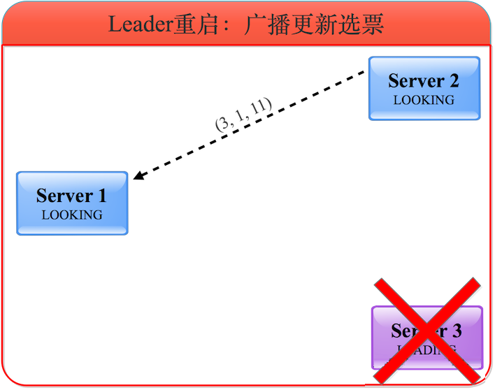 旧的Leader恢复后,进入LOOKING状态并发起新一轮领导选举,并将选票投给自己。此时服务器1会将自己的LEADING状态及选票(3,