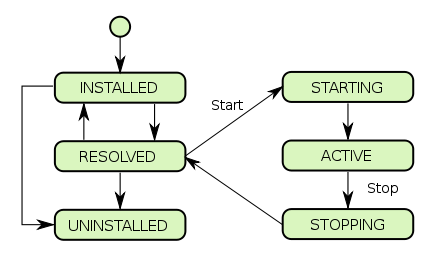 package,required bundle,如寻找则进入检查,检查没有冲突就形成绑定关系,以便加载类的时候能直接加载(但仅仅Resolved,不代表类被加载了)。如果你的BundleActivationPolicy是LAZY惰性加载,bundle.loadClass()调用才会到达Active状态。如果你的bundle的MANIFEST.MF中配置的Bundle-activator存在,那就调用其start方法,从starting进入active状态。