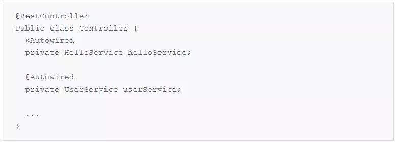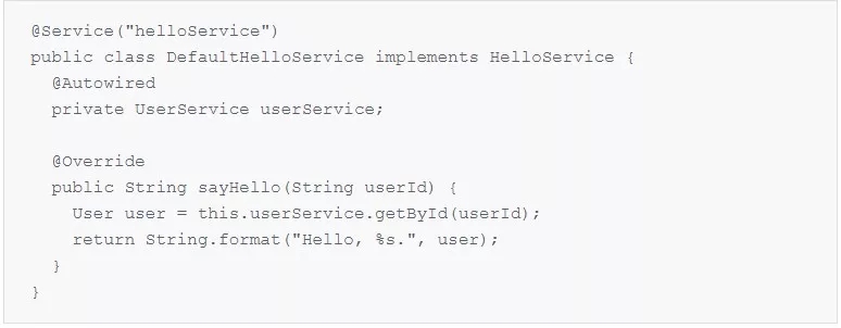 注解声明为一个服务,服务 id 为 helloService(同样,该名称在后面的改造过程中会被用到)。该类型内部注入了一个