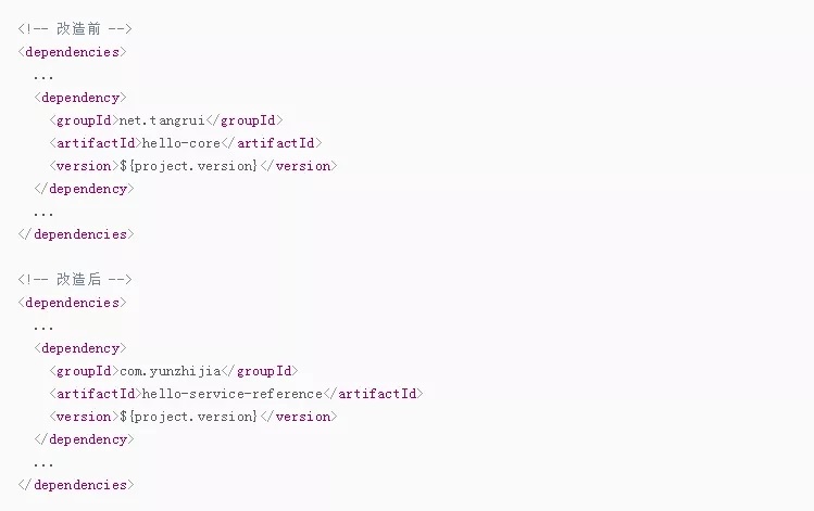 模块,再通过 hello-service-reference模块间接依赖 hello-api。改造前后的依赖关系分别为: