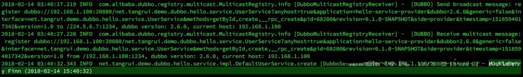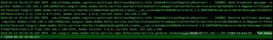 DefaultUserService 里面的那几行日志输出了,回到 hello-service-provider