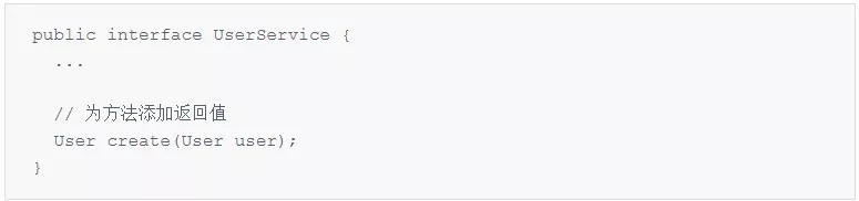首先,修改 UserService 接口的 create 方法,添加返回值: