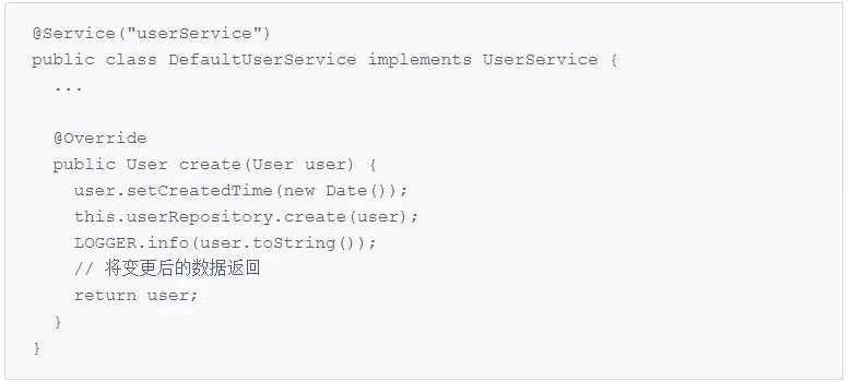 UserService.create方法进行处理(这回调用的就是 DefaultUserService里面的实现了)。至此,这个被设置过