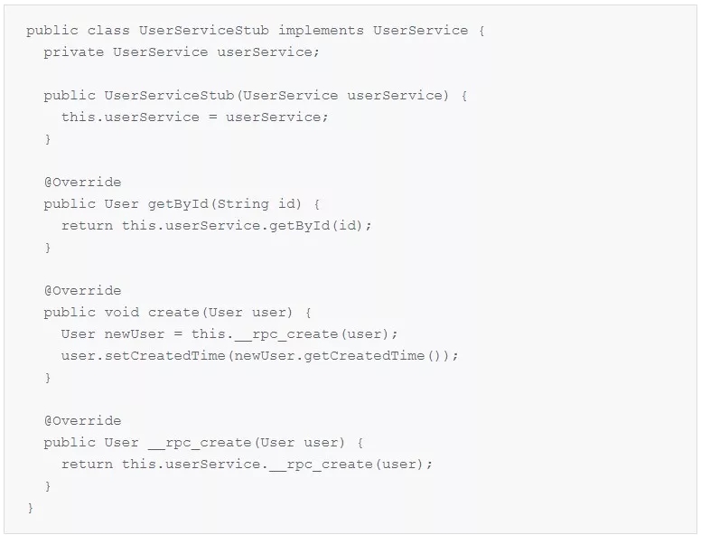 首先,为 UserService 接口添加一个新的方法 __rpc_create。这个方法名虽然看起来有些奇怪,但却有两点好处:第一、不会和已有方法重名,因为