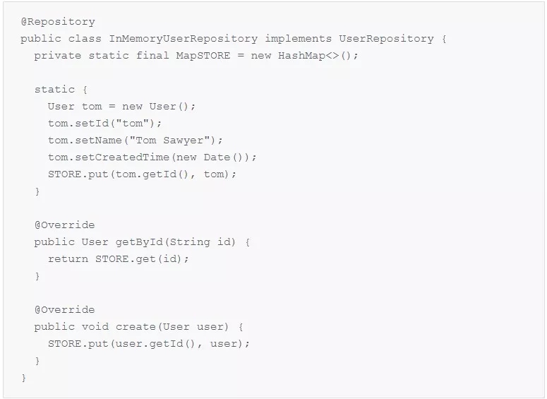 对象存储到 STORE 中。由于所有这些操作都只是在内存中完成的,因此该类型被叫做 InMemoryUserRepository。