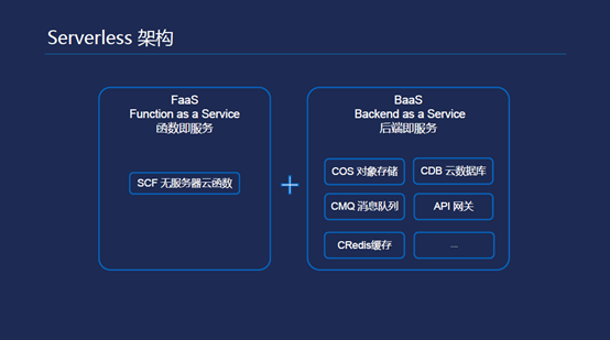 接下来我们来看一下Serverless架构是什么。Serverless从物理机或虚拟机的使用上进行了分离,更关注上层业务的运行情况。Serverless架构包含两块:函数即服务和后端即服务。函数即服务提供的是计算能力。原有的计算能力,无论是容器也好,虚拟机也好都承载在一定的操作系统之上,函数即服务把计算能力进行了进一步抽象,我们在后文再继续进行展开。另外,Serverless还有后端即服务,比如对象存储,数据库应用,缓存服务,我们也可以称之为Serverless,因为这些服务也能够在云上提供开通即服务,开通即使用的能力。在使用这些产品时同样不需要关注它的服务器是什么样的,它的服务器部署在哪里,而是服务开通就可以使用了,后面的运维工作都交给了云,所以不用感知它的最底层服务器,因此我们也可以把它称之为Serverless。这种服务就称之为Serverless后端即服务。这两个合起来可以称为Serverless架构。