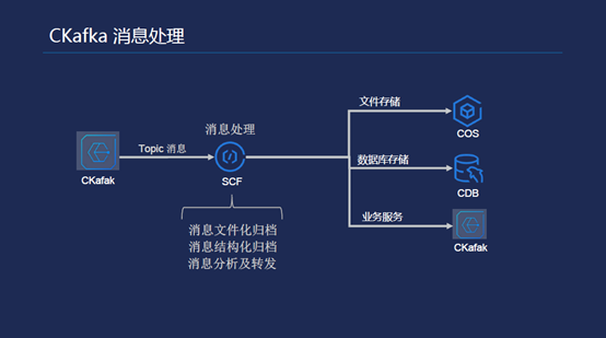 再就是CKafka消息处理。CKafka目前比较多的应用场景是做日志存储和日志搜集,例如有多台应用服务器在不断产生日志的情况下,可以把日志写到CKafka,然后CKafka再进行归档和后续分析。而