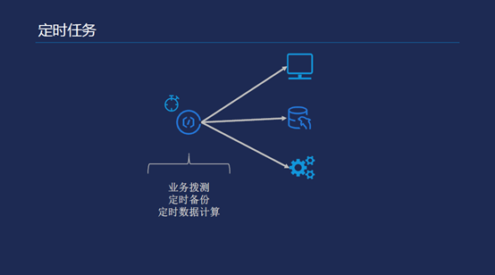 脚本的情况下,大家通常还要关心脚本运行是否成功,这台虚拟机是否还在工作。云函数抛弃了大家使用传统的虚拟机或者物理机来去写crontab脚本还要确保可靠性的问题。而在实际使用定时器触发的场景下,这里也有几种用法:一种是业务拨测。这个是周期性的去拨测业务是否还在工作,如果出现异常的情况下能够及时的发出告警,发出邮件或者短信告诉到运维或开发人员。