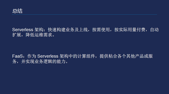 总结:Serverless架构本身给用户带来什么?它实际上就是允许我们更关注业务代码,因此可以更快速的构建业务然后上线。现在互联网开发速度越来越快,因此大家期望的是进一步加快开发和业务真正上线的速度,提高迭代的能力。因此,使用Serverless的话可以更快速让业务上线,让我们更快实现我们的想法。而按需使用是我们这个业务在上线之后,在真正产生请求后,业务才会被调动触发,才会有计算。而如果你的业务产生了爆发式增长,其实也不需要担心平台承载能力或者业务扩展是否跟得上,因为平台提供自动扩展能力,降低了大家对运维的诉求,大家不用关心很底层的东西,而运维人员也可以更偏重流程化和业务相关的运维。这就是Serverless架构给大家带来的一些好处。而作为Serverless里的核心,函数即服务这种产品,是Serverless中所呈现出来的计算型的组件,大家也可以看到它和触发源和后端的各种产品或服务有紧密关联,它可以更多的被看做是云时代的脚本,类似于黏合剂,把前面的触发源和后端的各种存储,数据,服务进行了黏合,真正实现架构落地,才是真正实现业务逻辑落地的能力。
