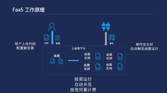 函数即服务的工作原理是什么样的?在Serverless上是怎样提供计算能力的?大家原来使用容器或者虚拟机的时候都可以知道,我们把代码上传到容器或者上传到虚拟机,然后启动一个进程,代码就可以运行,它就可以接受外部的请求,做一些实时的响应。Serverless和原有的容器或虚拟机不同,实现的是计算托管服务,Serverless用户首先要做的,是把我们称为云函数的代码,提交到平台上进行代码托管;然后要做的是配置触发器。为什么需要配置触发器?因为云函数的运行方式是触发式运行,有触发的时候,代码才会真正运行起来。所以配置触发器意味着我们给它设置了一个触发源,也就是定义了在什么事件下代码才真正运行起来。用户代码托管到平台之后,事件没有到来之前,它仅仅是代码文件和配置存储,代码并没有运行。什么情况下运行?是当事件触发真正到来的时候,云函数才会真正启动一个实例,这个实例就意味着一个计算单元。计算单元被拉起后,这个事件就被传到这个计算单元中进行计算处理。如果这个触发源的事件很多,并发很高的情况下,平台会根据事件的堆积情况,或者事件到达的速度,自动把同一份代码和配置拉起多个实例进行并发处理。因此可以看到Serverless的运行是按需运行,意味着只有在事件到来的情况下,代码才会被拉起,才会运行起来。