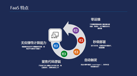 从上面的原理可以看出函数即服务的一些特点,比如说代码托管,云函数平台所提供的直接就是运行环境,也就是支持各种开发语言的环境;对于开发者或者函数服务使用者来说,并没有感知到它下面的服务器在哪里,而是由函数平台完成了函数运行的调度。因此实际来讲不需要运维,包括操作系统优化,服务器维护等等这些都是由平台进行承载。