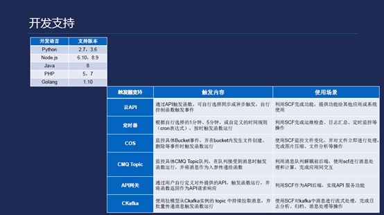 接下来是触发器,因为触发器越多,云函数所能去使用的场景其实也越多,我们已经实现的触发器有定时触发器;腾讯云对象存储服务,包括文件的上传、删除等时间;CMQ