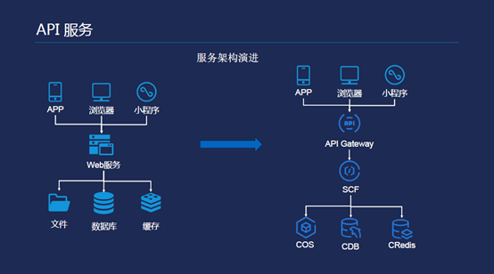 下面介绍一下在什么场景下Serverless可以落地?第一,在Serverless场景中最常用到的就是API服务。大家知道实现一个API服务,无论是把API给到浏览器应用,还是给到手机APP使用,还是给到小程序应用,给到它们的时候是以API实现的。要实现这个要有WEB服务器接收连接,对接后端的业务代码,如果你要再进行文件存储,后端的结构化存储,或者有一些缓存需要读写,你的应用服务器后面可能还要对接相应的文件存储,结构化数据库,后续如果想使用缓存,再对接到相应的服务器或相应产品。如果把现有的API服务向Serverless架构演进,那么它将怎么样呈现呢?