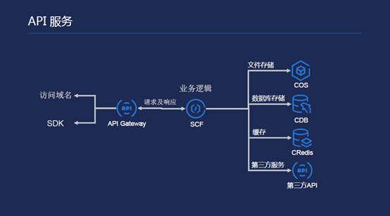 从整个服务架构来看的话,我们使用最前面的API网关,提供是API能力,甚至进一步能够直提供有SDK服务,更加的方便开发。SDK提供了各种开发语言来直接进行API调用。云函数在中间起到的是业务逻辑处理的作用,而状态数据或者其他业务数据的存储是依赖于后面的文件存储或者数据库进行的。API服务也是Serverless最常用的一种落地形式。