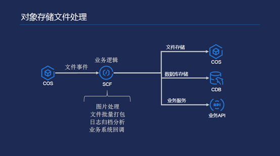 这里介绍的场景,都是我们客户在实际使用的场景。在 serverless落地场景中,对对象文件的处理也很常见。对象文件处理指的是对对象文件进行操作后的回调处理。回调通常是在对象文件创建或删除操作后产生的事件。云函数可以在获取到这个事件后进行后续的处理。这里常见的处理逻辑是下面几种,比如说图片处理,针对图片去生成各种尺寸的缩略图或者进行裁剪,然后再次存储到对象存储数据中,之后可以根据不同客户端的请求展示不同大小的图片到前端。