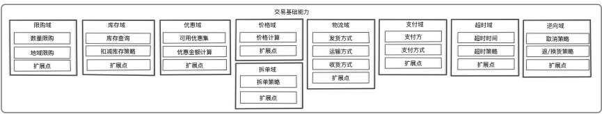 可以确定几乎所有的交易都会涉及下图中所有的领域(库存,优惠,价格…),而单看每个域,玩法都是很少变化的,将这些域的基础能力完全可以沉淀下来形成原子的基础能力,通过扩展点方式应对将来特殊的场景个性化扩展。