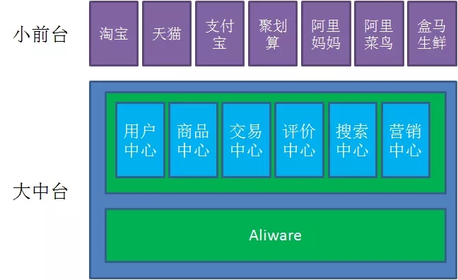 图中,阿里巴巴许多产品线的共通业务经过下沉,形成了中台的各种业务中心,而Aliware则是阿里巴巴的技术中间件平台,为各大业务线提供技术支持。