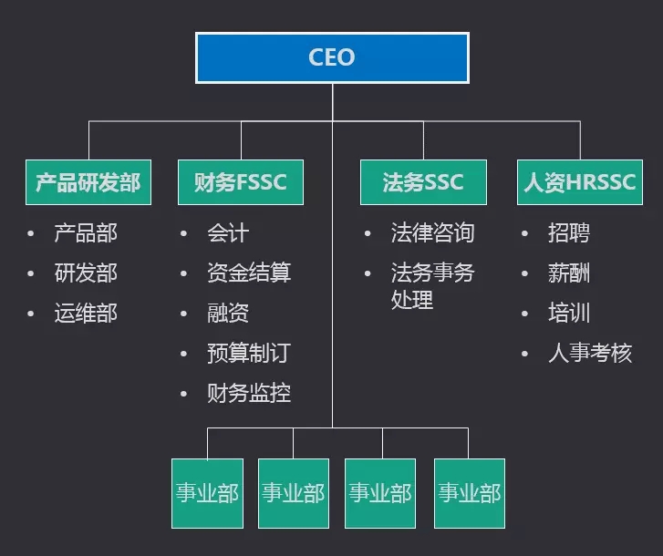 类似于财务共享服务中心FSSC(Financial Shared Service Center),人力资源共享服务中心HRSSC(Human Rersources Shared Service Center),其实就是典型的中台管理思路下的组织形态和职能部门建设的方法,如下图。