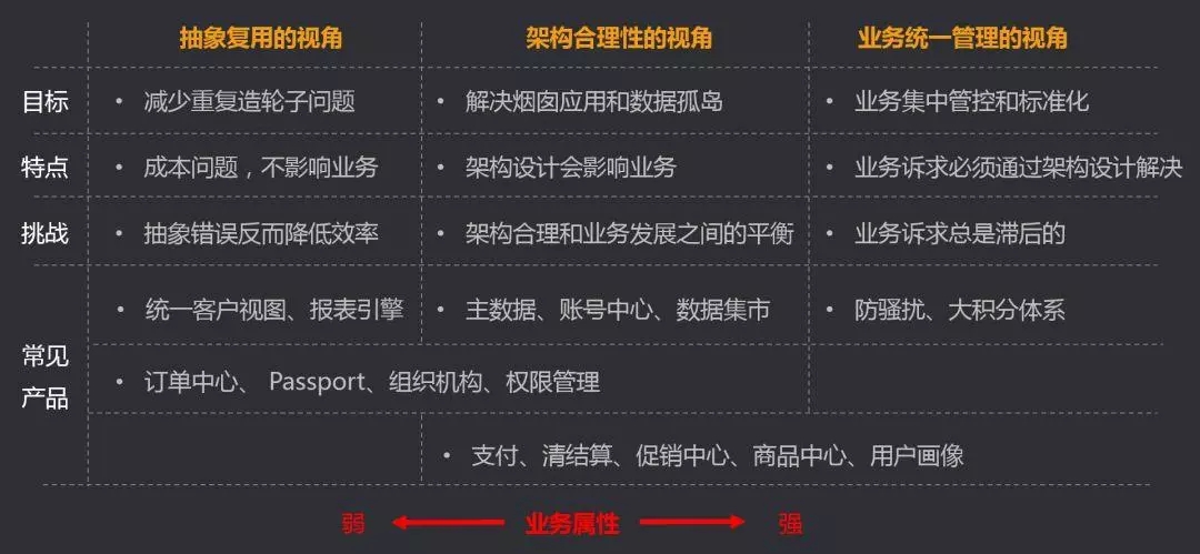 这三种视角(或叫三种模式),从左到右,业务属性从弱到强。即最左侧的抽象复用的视角,纯粹是成本问题,和业务关系不大;中间的架构合理性的视角,具备了一定的业务含义和业务价值;最右侧的业务统一管理的视角,则完全是个业务问题了。
