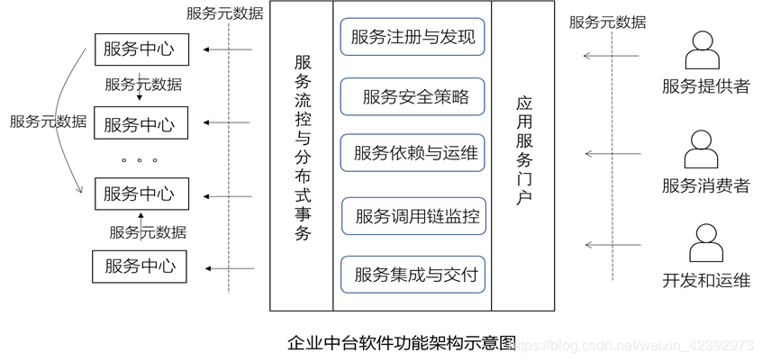 (1)服务元数据 服务元数据是指对服务的属性、操作和组件的描述信息。整个中台必须有统一标准的服务元数据,需要制定规范。在中台的都是依据这些服务的元数据实现服务注册、发现、维护和运营等功能。