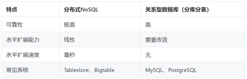 水平扩展能力:对于分布式NoSQL数据库,数据天然是分布在多台机器上,当一台机器上的数据量增大后,可以通过自动分裂两部分,然后将其中一半的数据迁移到另一台机器上去,这样就做到了线性扩展。而关系型数据库需要在扩容时再次分库分表。