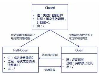 1)服务正常运行时的 Closed 状态,当服务调用失败量或失败率达到阈值时,熔断器进入 Open