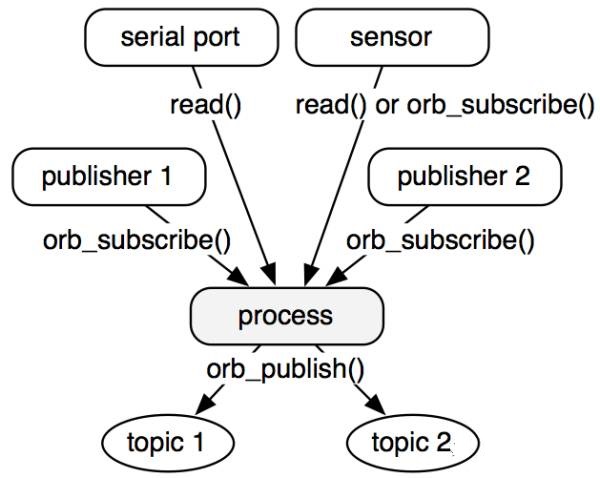 飞控中每个进程都可以通过Publish/Subscribe(发布/订阅)模式与其他进程以及驱动进行连接。以传感器应用程序发送传感器数据到姿态估计应用程序为例。进程(或者称节点)通过命名的总线交换的消息称之为“主题”,在系统中,一个主题仅包含一种消息类型,例如:vehicle_attitude
