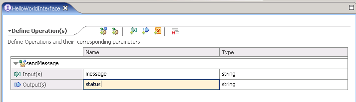 HelloWorld接口包含一个sengMessage操作,输入为一个名为message的字符串,输出一个名为status的字符串。可以通过点击接口编辑器上方的按钮来添加一个操作。通过和分别来添加输入和输出参数。图示如下: