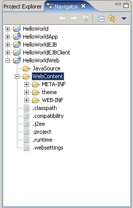 6. 检查生成的项目。如果把WID切换到J2EE透视图的导航视图中,我们可以看到与HelloWorld模块对应的J2EE项目。J2EE企业项目为HelloWorldApp,其包含EJB项目HelloWorldEJB,Web项目HelloWorldWeb,J2EE客户端项目HelloWorldEJBClient。另外一个是名为HelloWorld的Java项目,这个项目的内容最终会以一个JAR文件的形式被HelloWorldApp应用使用。上一步中所提到的JSP文件需要在HelloWorldWeb项目中生成。具体如下图所示: