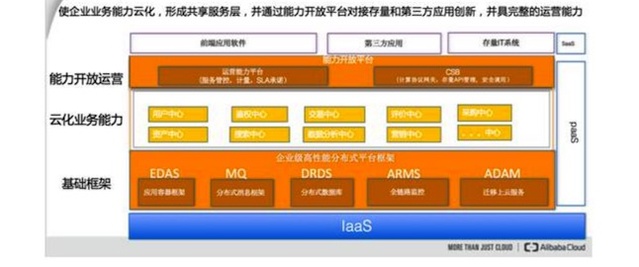 在整个技术架构的最底层是 EDAS、DRDS、ONS 等组成的基础应用架构。电商、物流、移动IM、地理信息、医疗等都有自己的能力且都把能力进行开放,形成了IT共享业务架构层,用来支撑上层的业务。一旦业务需要合作,下层的技术可以快速响应。
