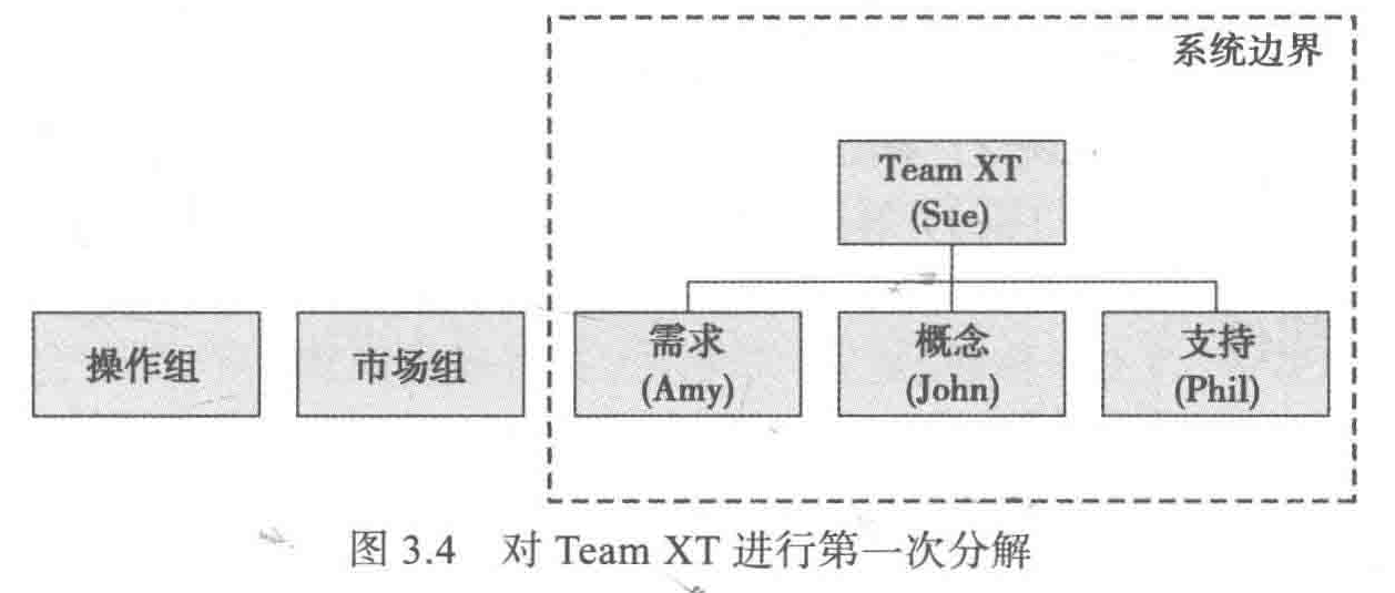 分解方式:取决于系统元素的构成情况。不同元素构成的系统,把team XT按照成员进行分解。元素的形式不确定,可以考虑按照功能来分解(例如,转向机制,压缩机,排序算法)。按照功能分解比较好。