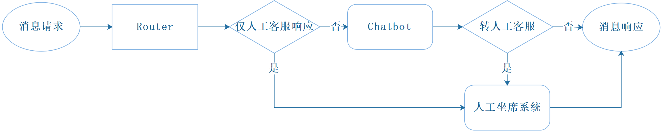 Chatbot,那么人工坐席系统的消息也需要经过 Chatbot,不但增加了消息流转环节,而且导致人工坐席服务和