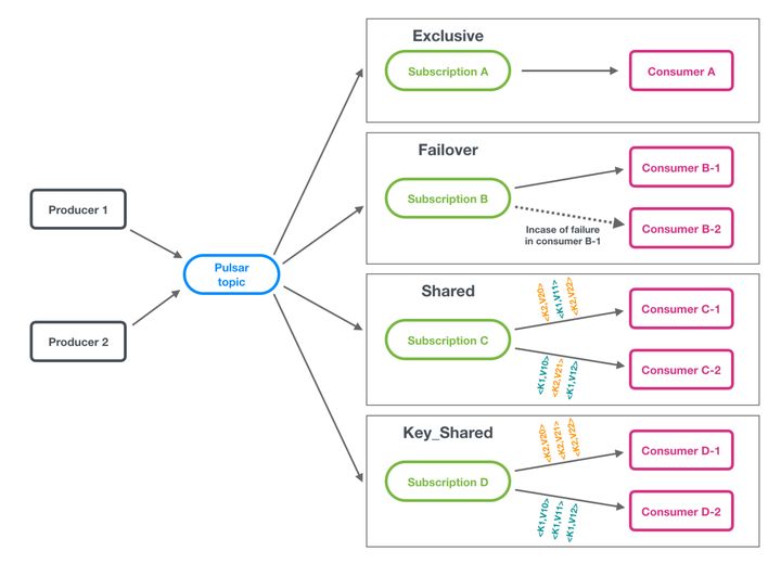Pulsar支持exclusive、shared和failover三种消息订阅模式,这三种模式的示意图如下: