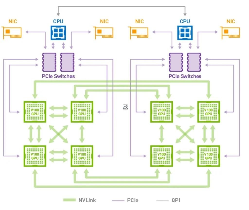 随着单GPU的计算能力越来越难以应对深度学习对算力的需求,人们自然而然开始用多个GPU去解决问题。从单机多GPU到多机多GPU,这当中对GPU互连的带宽的需求也越来越多。多机之间,采用InfiniBand和100Gb Ethernet去通信,在单机内,特别是从单机单GPU到达单机8GPU以后,PCIe的带宽往往就成为了瓶颈。为了解决这个问题,NVIDIA提供了NVLink用以单机内多GPU内的点到点通信,带宽达到了160GB/s, 大约5倍于PCIe 3 x 16. 下图是一个典型的单机8 P100拓扑。