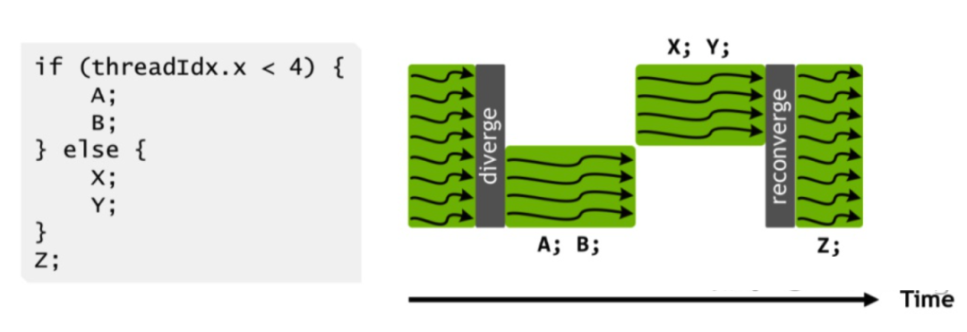 直到第一个分支完整结束,才会执行另一个分支。这意味着同一个warp内不同分支失去了并发性,不同分支的线程互相无法发送信号或者交换数据,但同时,不同warp之间的线程又保留了并发性,这当中的线程并发存在着不一致,事实上如果程序员不注意这点,很可能导致死锁。