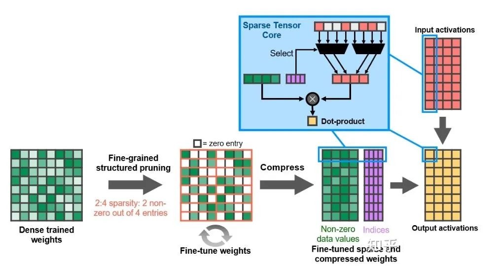首先使用正常的稠密weight训练,训练到收敛后裁剪到2:4的结构化稀疏Tensor,然后走fine tune继续训练非0的weight, 之后得到的2:4结构化稀疏weight理想情况下具有和稠密weight一样的精确度,然后使用此稀疏化后的weight进行Inference. 而这个版本的TensorCore支持一个2:4的结构化稀疏矩阵与另一个稠密矩阵直接相乘。