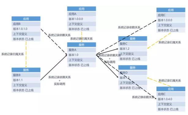 一个平台包含多个系统,一个系统包含多个应用,一个应用包含多个服务。应用实例是从应用定义对象的实例化。服务实例是从服务定义对象的实例化。