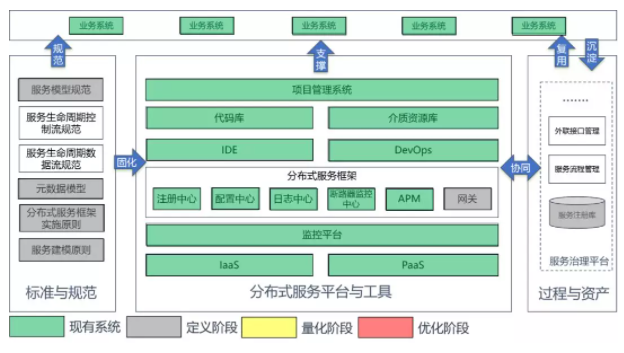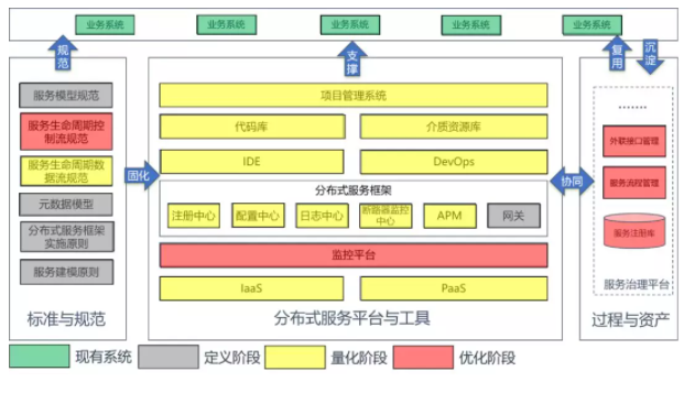 - 服务治理项目团队需要制定出符合企业IT架构发展的技术标准和管理流程,并能够提供相应的管理工具对关键环节进行稽核,对标准和流程的执行情况能够及时度量。