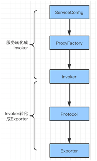 此时,Invoker 会被定义 Protocol,之后会被包装成 Exporter。最后,Exporter 会发送到注册中心,作为服务的注册信息。上述流程主要通过 ServiceConfig 中的 doExport 完成。