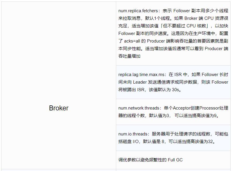 副本的同步速度。这是因为在生产环境中,配置了 acks=all 的 Producer 端影响吞吐量的首要因素就是副本同步性能。适当增加该值后通常可以看到