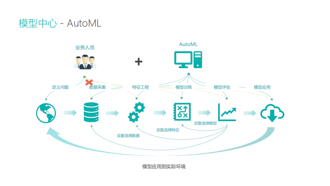 先从业务角度定义诸如反欺诈等业务问题,然后由数据科学家或者IT做数据采集,再交由算法科学家做特征工程,接着模型训练和评估。整套流程是需要反复地选择数据、特征和模型,上线阶段还涉及算法和工程问题,比较耗时耗力。而AutoML可以帮助覆盖掉流程中的数据采集、特征工程、模型训练和模型评估的大部分工作。