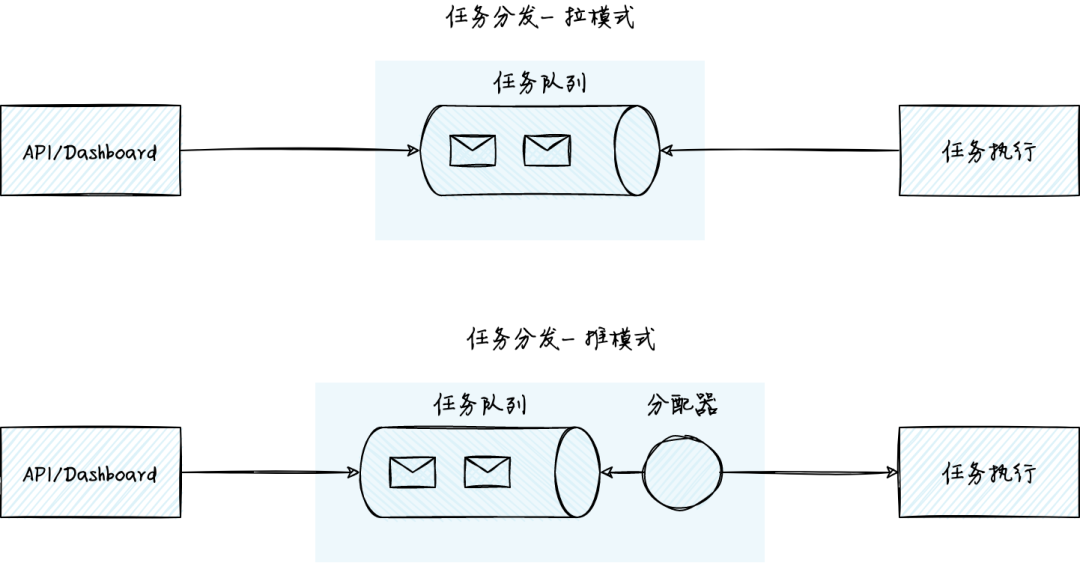 任务分发的架构可分为拉模式和推模式。拉模式通过任务队列分发任务。执行任务的实例主动从任务队列中拉取任务,处理完毕后再拉取新任务。相对于拉模式,推模式增加了一个分配器的角色。分配器从任务队列中读取任务,进行调度,推送给合适的任务执行实例。