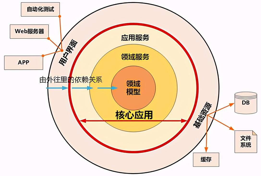 也就是说,在下图的六边形架构中,红圈内的核心业务逻辑(应用程序和领域模型)与外部资源(包括APP、Web应用以及数据库资源等)完全隔离,仅通过适配器进行交互。它解决了业务逻辑与用户界面的代码交错问题,很好地实现了前后端分离。六边形架构各层的依赖关系与整洁架构一样,都是由外向内依赖。
