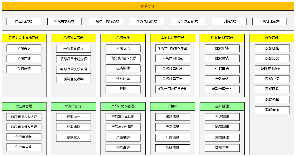 即当我们流程分析到最底层后,我们就可以抽象输出一个最底层的业务架构图。比如对应供应链和采购管理,我们可以输出到最底层的业务架构图或业务组件图。