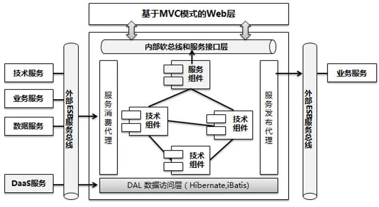 业务组件以 Web 服务的方式提供接口,通过企业服务总线连接。业务组件内部为了实现高可复用性和高效性,采用基于