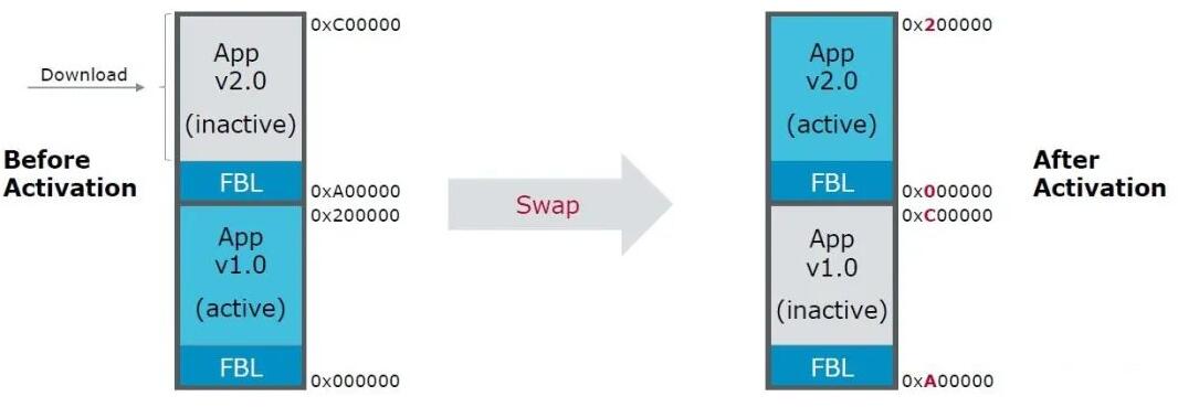 第2种,A/B交换方法与第1类的差别在于ECU硬件不支持地址重映射,激活新版本软件的入出地址变化。