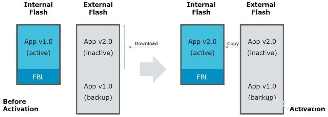 第3种,基于外扩内存的A/B交换方案,该方案是需要额外的外扩内存,备份当前版本软件和旧版本软件,新版本软件会先刷写原先的旧版本软件空间,然后擦除ECU内存的当前版本软件,刷写新版本软件,完成激活。