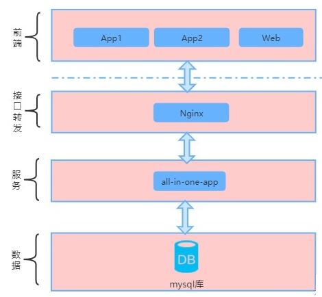重构发生的背景是,原有的系统架构采用all-in-one的方式,随着业务的快速发展,用户访问量急剧上升,系统请求流量成倍增长,陆续出现了各种问题。当时的系统架构的示意图如下